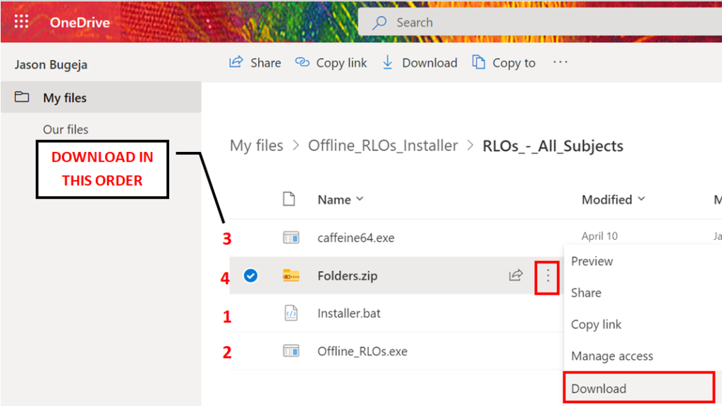1. Download the files individually on your device; start by clicking … next to installer.bat and click Download. Do the same for Offline_RLOs.exe followed by, caffeine64.exe and finally Folders.zip. Always wait for each file to download completely before downloading the next file and leave Folders.zip for last. The download process will take roughly 60 minutes depending on your connection. By default the files will be downloaded to the Downloads folder or a location that you choose, it is important that you download the four files to the same location. Disk space required is 36.6GB.
